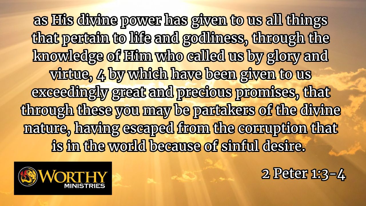 2 Peter 1:3-4 as His divine power has given to us all things that pertain to life and godliness, through the knowledge of Him who called us by glory and virtue, 4 by which have been given to us exceedingly great and precious promises, that through these you may be partakers of the divine nature, having escaped from the corruption that is in the world because of sinful desire.